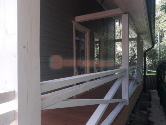 На террасе при условии что она есть делаем перила из строганной доски со всех сторон, столбы террасные также строганные, а не обрезки профилированного бруса с шипом и пазом. Домкратики на столбах для дальнейшей регулировки. Балясины будут сделаны аккуратно. Обратите внимание что в дешёвых случаях это может быть и будет просто вагонка прибирая к неотесанной доске снаружи и столбы будут не квадратные а просто профилированный брус как на видео.