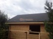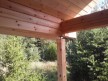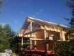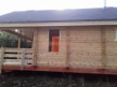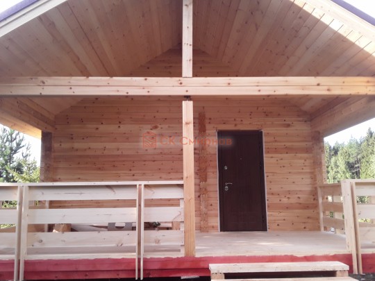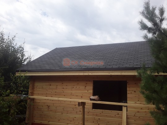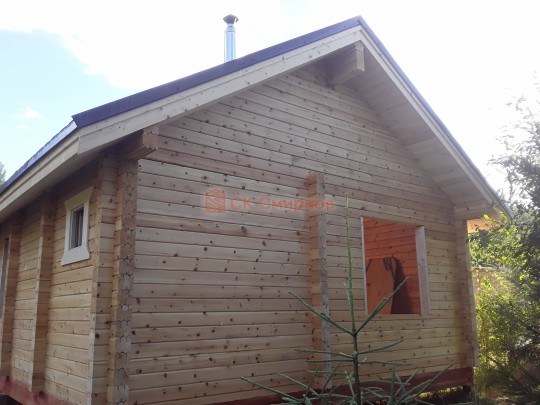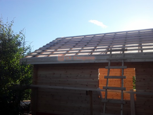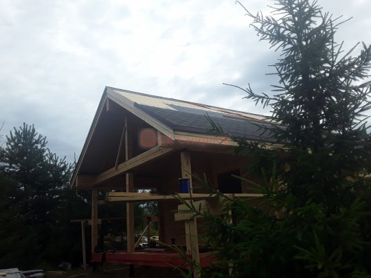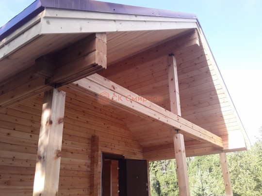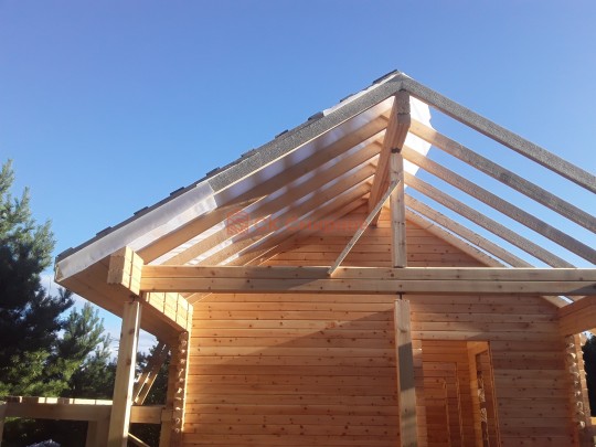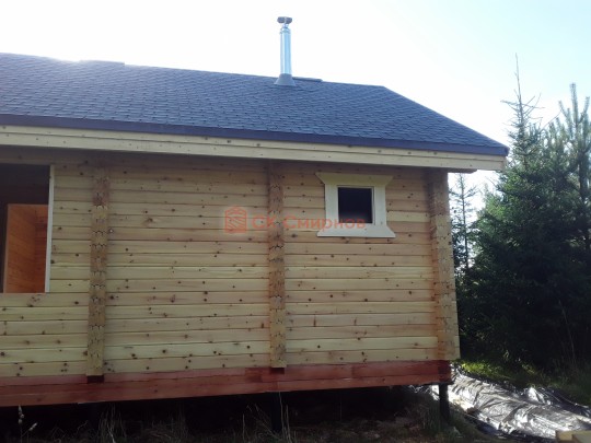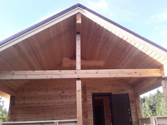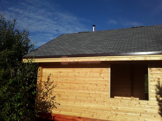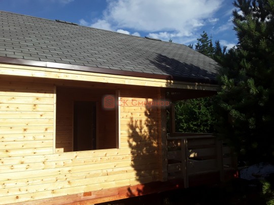 Крыша сделана с увеличенными выносами для лучшей защиты сруба от дождей и снега. Кровля — мягкая битумная черепица.