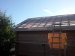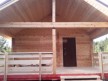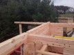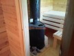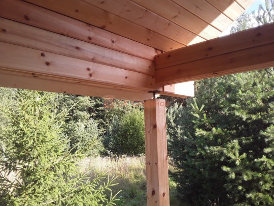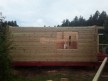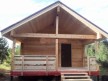 В этой бане сделана большая терраса на регулирующихся столбах. Крышу усиливает поперечная балка — типично скандинавский приём, который также используется при строительстве фахверков.