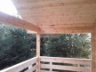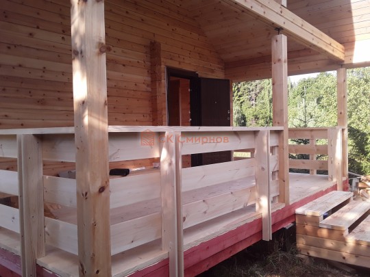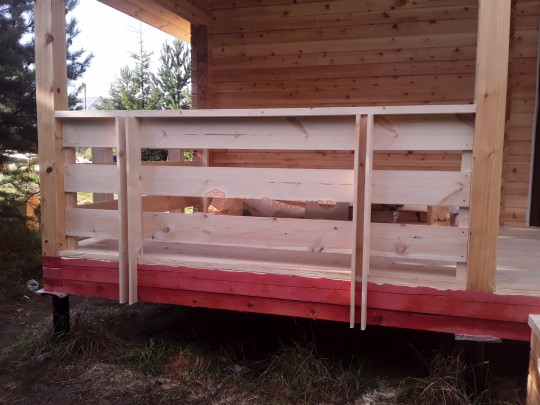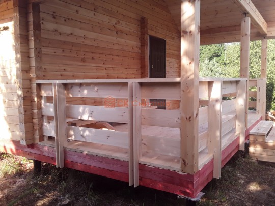 На террасе при условии что она есть делаем перила из строганной доски со всех сторон, столбы террасные также строганные, а не обрезки профилированного бруса с шипом и пазом. Домкратики на столбах для дальнейшей регулировки. Балясины будут сделаны аккуратно. Обратите внимание что в дешёвых случаях это может быть и будет просто вагонка прибирая к неотесанной доске снаружи и столбы будут не квадратные а просто профилированный брус как на видео.