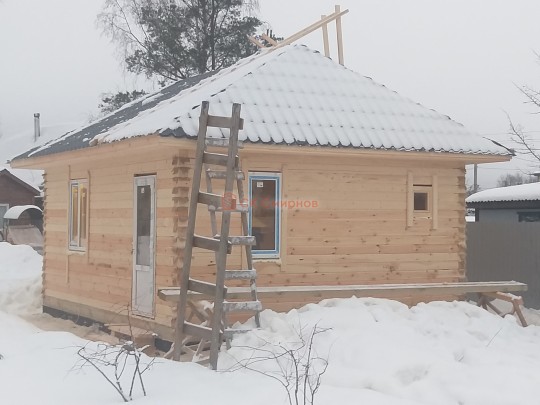 В ноябре 2020 мы завершили строительство первой одноэтажной бани с террасой 6 на 6 метров по проекту №306. Снаружи баня довольно простая: квадратный сруб, шатровая крыша, довольно просторная терраса. Таких бань по русским деревням и посёлкам найдётся немало. Нашу баньку отличает, прежде всего, качество исполнения.