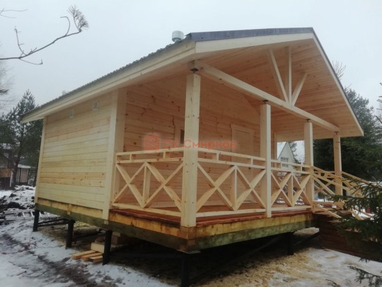 Сам проект стал топовым в 2020 году. Выносная терраса 12 кв.м. под общей двускатной крышей выглядит очень уютно — перекрёстные балки сверху не только распределяют нагрузку на крышу, но и великолепно вписываются в общий дизайн бани. Крышу поддерживают мощные брусовые столбы с домкратиками для регулировки уровня. Если сруб даст усадку, то можно просто выставить нужный уровень — и никаких перекосов.