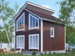 На фото представлен проект загородного дома №145 габаритами 6х7.5 метров и отличной планировкой общей площадью 76.5 квадратных метров. Можно выделить несколько особенностей проекта: панорамные окна. Объект полутораэтажный, может использоваться как дачный.
