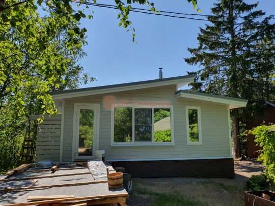 В июне 2020 мы строили красивую современную каркасную баню под ключ для смелых, готовых к нестандартным решениям клиентов. Был выбран одноэтажный проект бани с панорамными окнами, стеклянной дверью-стеклопакетом и дизайном в стиле Хай-Тек.